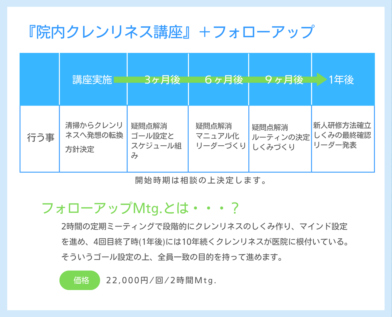 また、クレンリネスが仕組みになるまで皆さんと一緒に進めて行くフォローアップも用意しています。